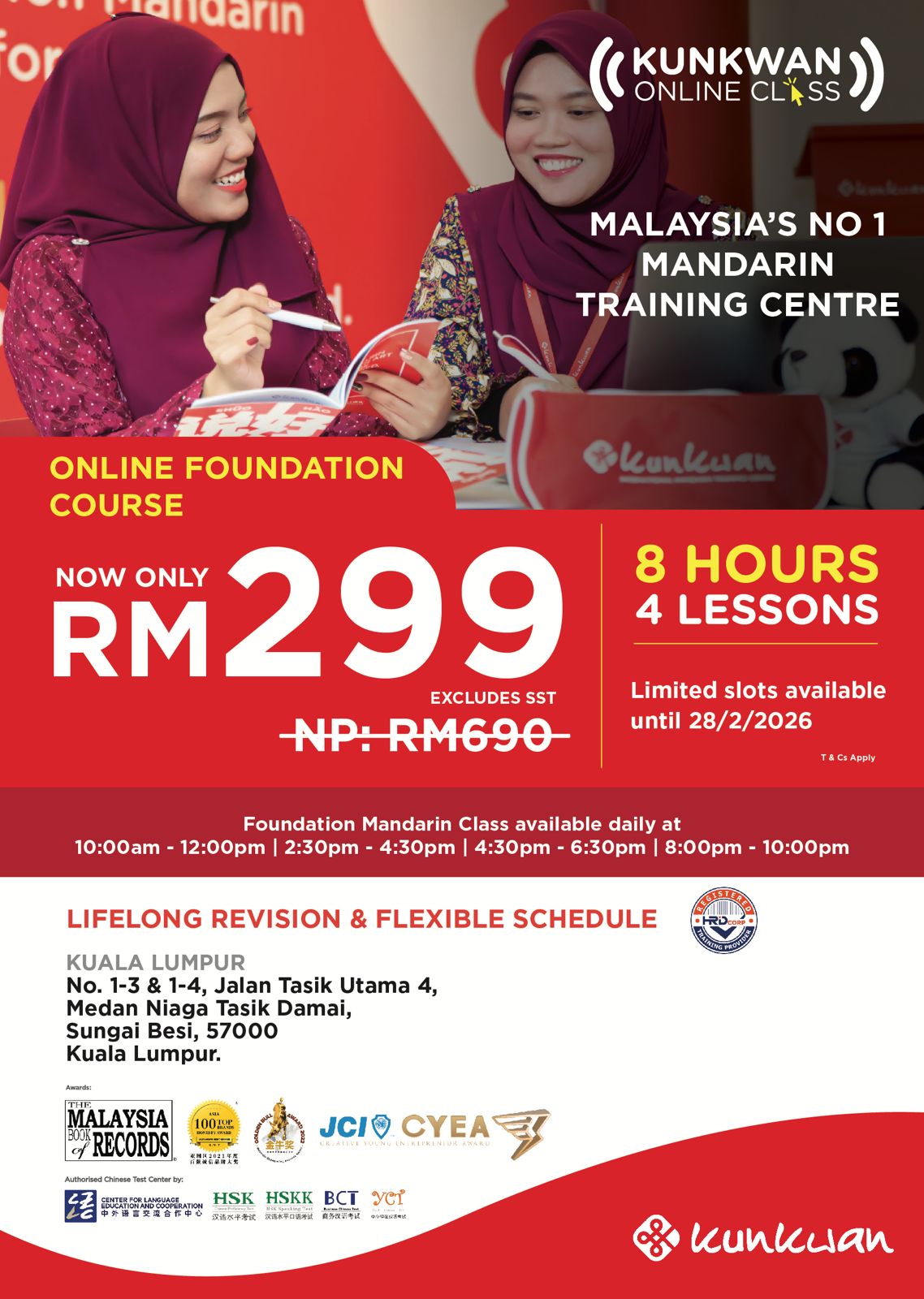 Kelas Asas Bahasa Mandarin hanya RM299 untuk 8 jam. Terhad kepada 20 orang yang terawal sebelum 28th February 2026.